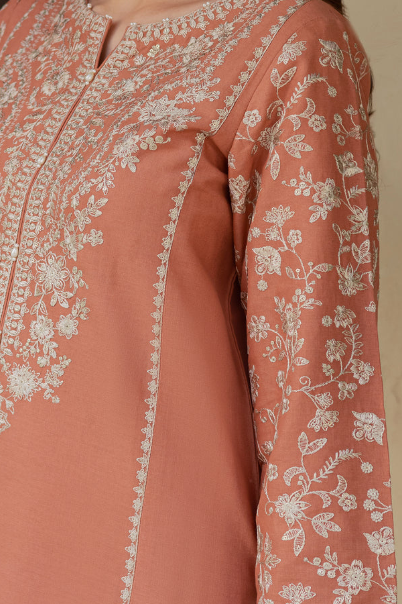 This khaddar set features a long paneled embroidered shirt with a heavily composed neckline and fully embroidered sleeves finished with a dense jaal.